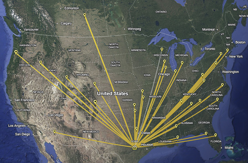 For my first POTA activity, Sarah, Sherry, and I went to Pedernales Falls State Park on November 13, 2025, where I set up a radio and made 32 contacts. The figure shows 31 of the 32 locations contacted. Two of the stations were in the same grid (FN10 in Pennsylvania). This figure comes from Google Earth.