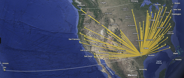 For my second POTA activity, Sarah, Sherry, and I went to McKinney Falls State Park on April 23, 2026 where I set up a radio and made 81 contacts. The figure shows the general locations of the contacts. This figure comes from Google Earth. 57 of the 81 QSO were confirmed either by LoTW or QRZ.